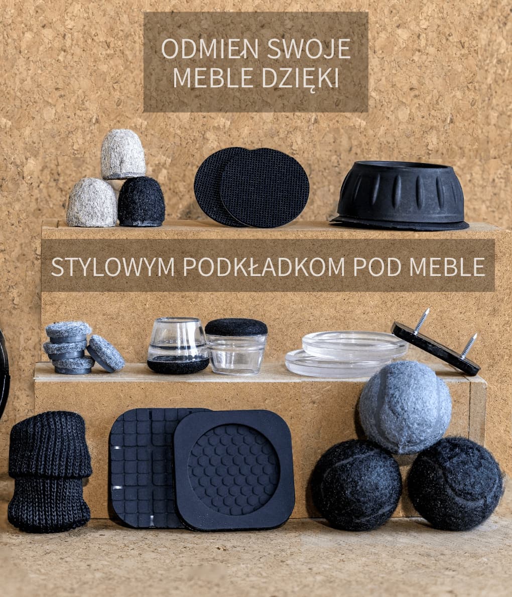 Plastikowe podkładki meblowe chronią powierzchnie przed zarysowaniami i zużyciem. Są szczególnie polecane do mebli ogrodowych, ponieważ są odporne na wilgoć. Na dywanach ułatwiają również przesuwanie mebli. Jednak na delikatnych podłogach lepszym wyborem są okleiny meblowe samoprzylepne z filcu.